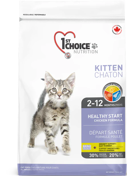 Notre formule 1st Choice Départ Santé est la meilleure initiation possible à la nourriture sèche après leur sevrage du lait maternel. Une formule riche en calcium pour bâtir des os solides, des acides gras pour un développement optimal des organes vitaux ainsi que des prébiotiques pour assurer un système immunitaire fort. Voilà ce qu’est un départ santé dans la vie! Longue vie à minet!