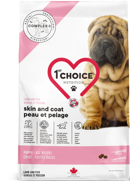 La formule PEAU ET PELAGE agneau et poisson a été conçue pour répondre aux besoins nutritionnels des chiots de toutes races. L’ajout d’oméga-3 et d’oméga-6 leur assure une peau saine et un pelage soyeux. Les petites croquettes débordent de saveur pour que la découverte de la nourriture sèche soit agréable et réussie. Cette formule complète et équilibrée soutient la croissance des os, le développement des fonctions vitales et le développement du cerveau, en plus d’aider les chiots à se bâtir un bon système immunitaire. Facile à digérer, elle constitue une option sans poulet très appréciée. La première étape pour grandir en santé et en beauté !