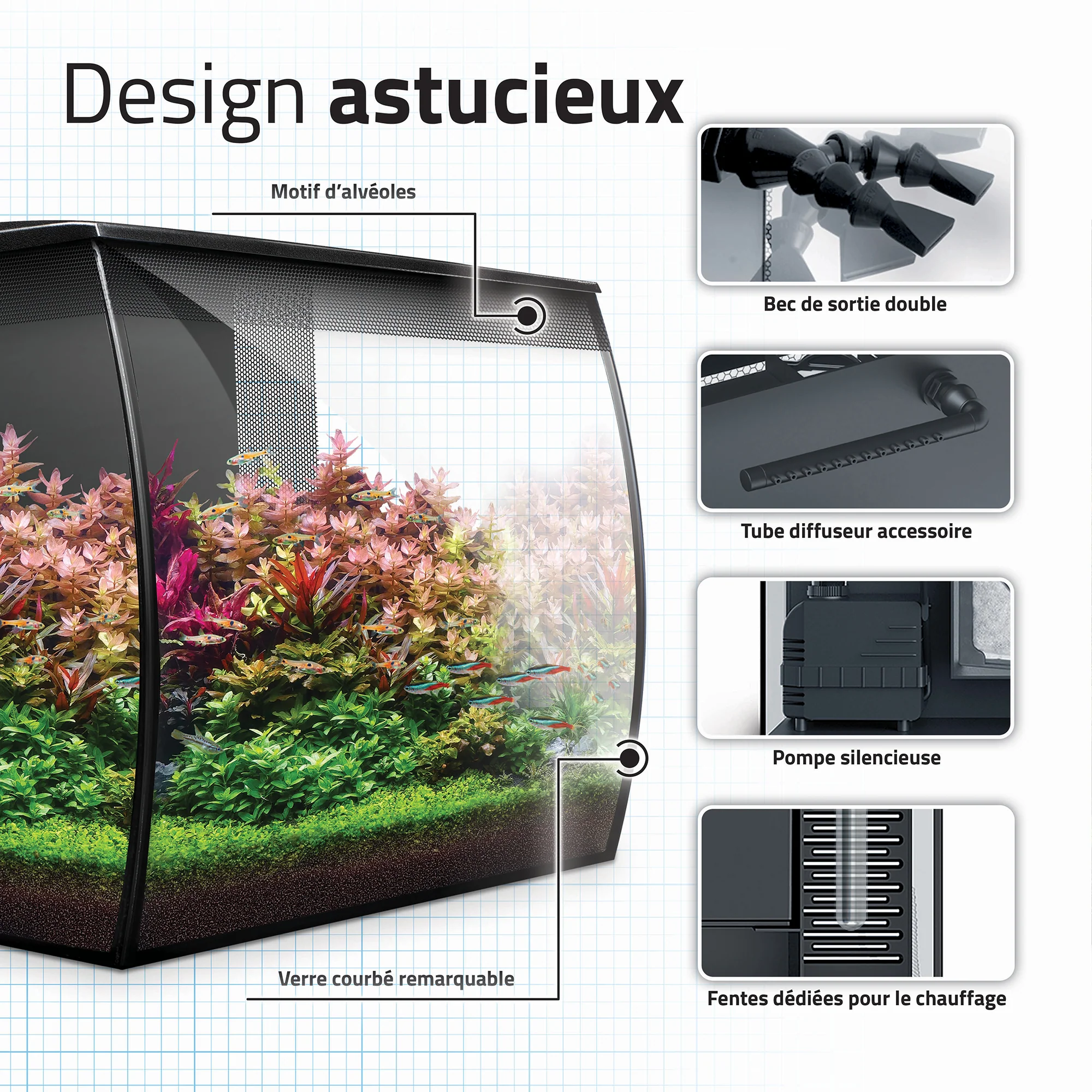 Découvrez la conception et la flexibilité par excellence dans le domaine des aquariums d’eau douce avec la nouvelle série améliorée Flex 2.0. Imaginez un éclairage personnalisable à DEL RVB et blanches pour des jeux d’éclairage hauts en couleur et des effets magnifiques. Visualisez un système de filtration intégré et reconfiguré avec options réglables de débit d’eau. La plus récente génération d’aquariums Flex rend tout ceci possible, et perfectionne même la convivialité grâce à plusieurs nouvelles améliorations du couvercle.