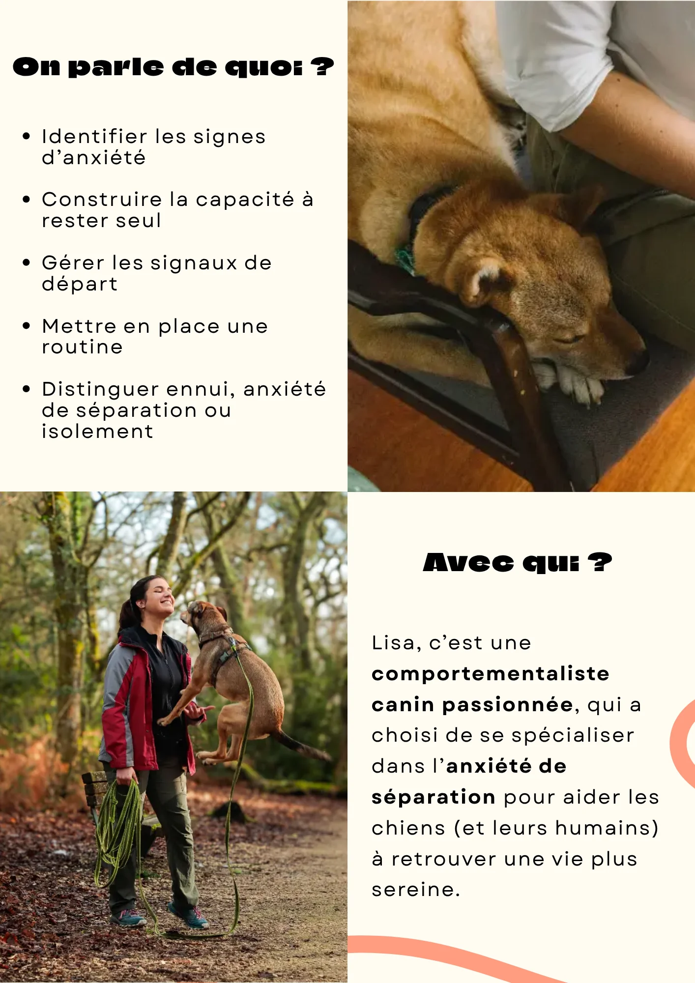 Participe à notre atelier éducatif animé par Lisa, comportementaliste canin, pour comprendre et prévenir l’anxiété de séparation. Tu découvriras des clés pratiques pour instaurer une routine équilibrée et rassurante pour ton chien.