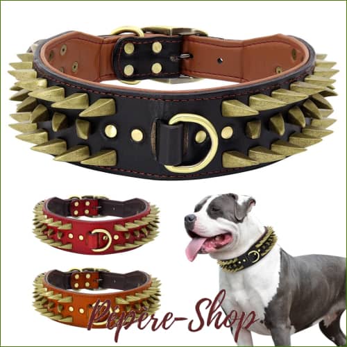 Ce superbe collier molosse en cuir, robuste et durable, se distingue par sa décoration par des pointes serties qui lui donne un aspect de meneur de clan.