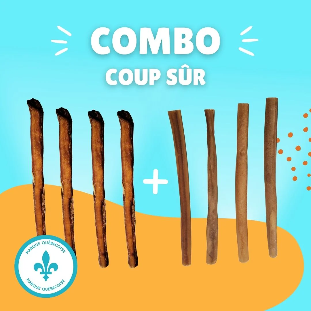 Le Combo Coup Sûr est spécialement conçu pour offrir à ton chien une expérience de mastication longue durée tout en prenant soin de sa santé dentaire. Avec ce duo gagnant de bully sticks 12’’ et de bâtons de collagène 12’’, tu assures à ton chien un plaisir sans fin, naturellement riche en collagène pour des articulations en forme 🐶💙.