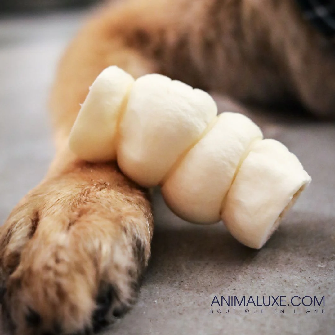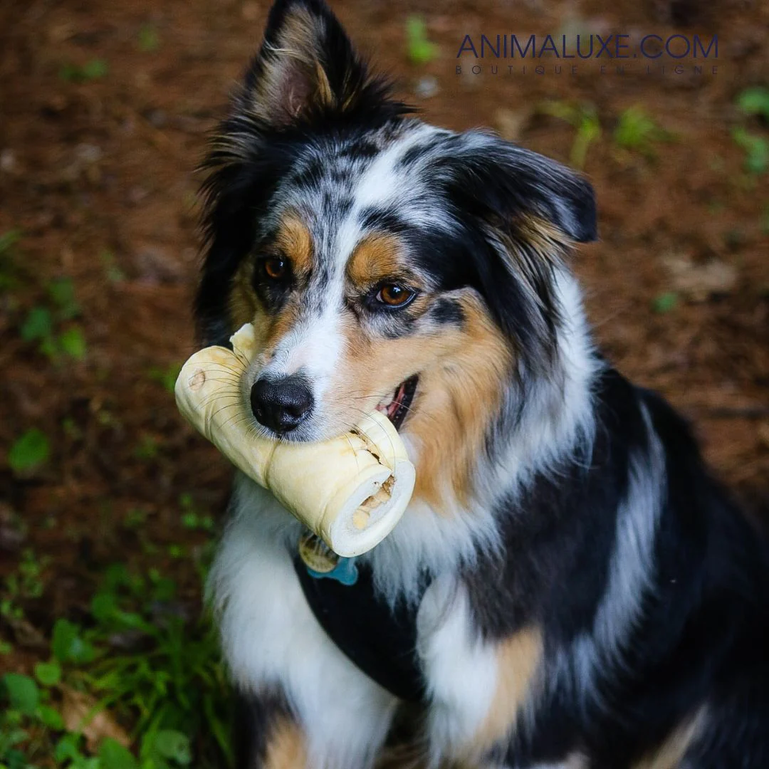Surveille toujours ton chien lorsqu’il déguste sa gâterie 🐶💙. Assure-toi qu’il ait toujours accès à de l’eau fraîche.