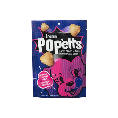 Fromm® POP’etts fait toujours l’affaire ! Ces craquelins sont la collation parfaite à tout moment – disponibles en quatre saveurs POPular que les chiens adorent :