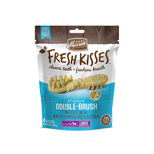 Les brosses Fresh Kisses® de Merrick, infusées de pellicules-fraîcheur à saveur de menthe, sont des gâteries dentaires innovatrices et naturelles conçues non seulement pour nettoyer les dents de votre chien, mais aussi pour rafraîchir son haleine en même temps. Les gâteries Fresh Kisses® de Merrick affichent une conception unique de brosse double, infusée de pellicules-fraîcheur à saveur de menthe, qui nettoie les dents tout en rafraîchissant l’haleine.