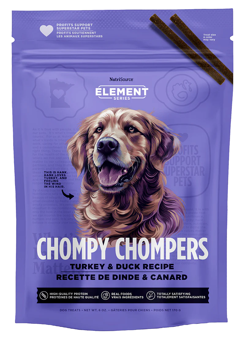 - Les chompy chompers de dinde et de canard de la série NutriSource Element sont fabriqués avec des protéines de haute qualité.