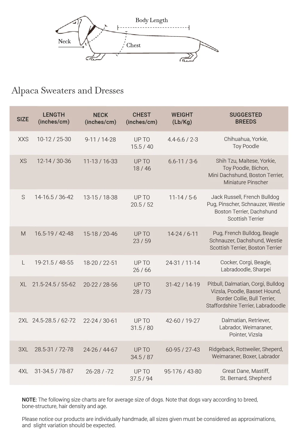 Tailles : tour de poitrine (au plus large) – longueur (du cou au bout du dos)