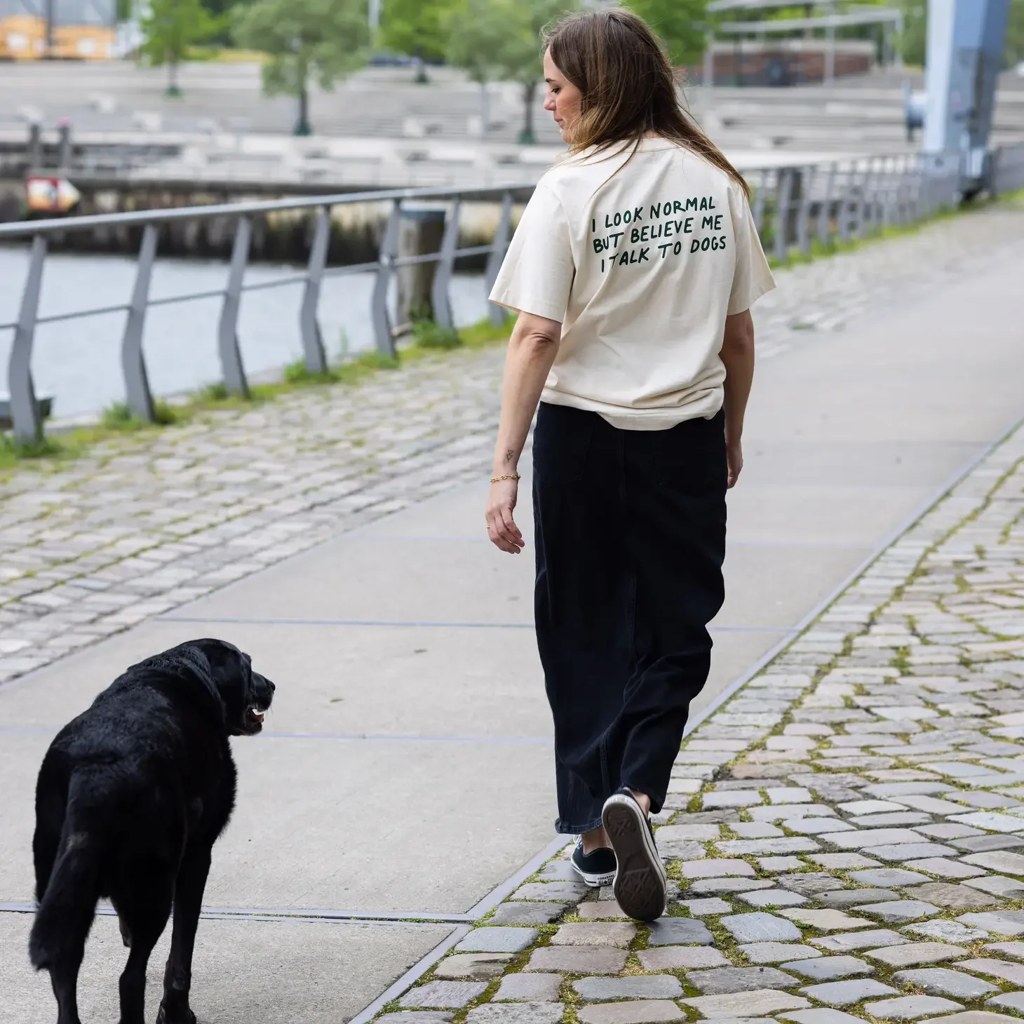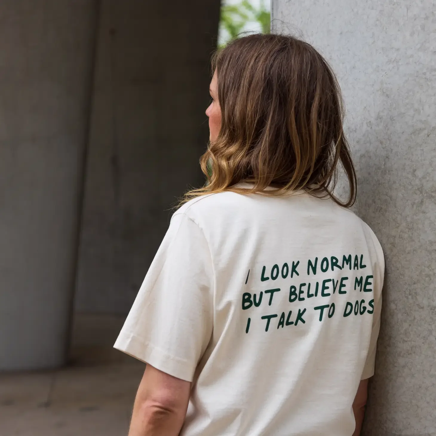 Ce t-shirt unisexe beige avec imprimé au dos « I look normal but believe me I talk to dogs »* est fabriqué en coton biologique.