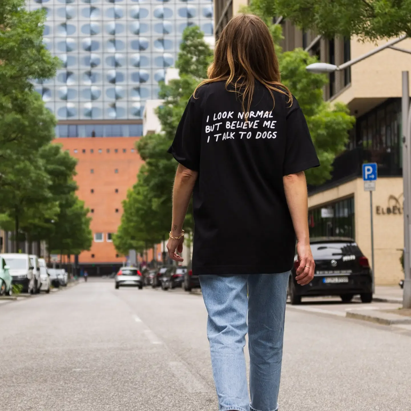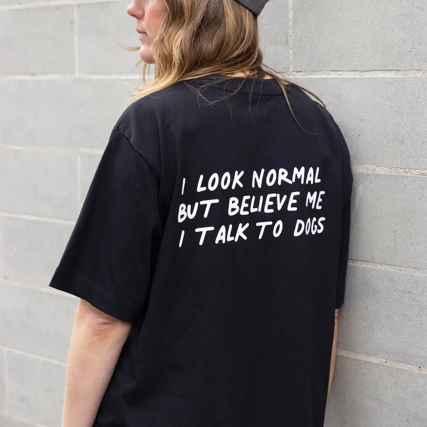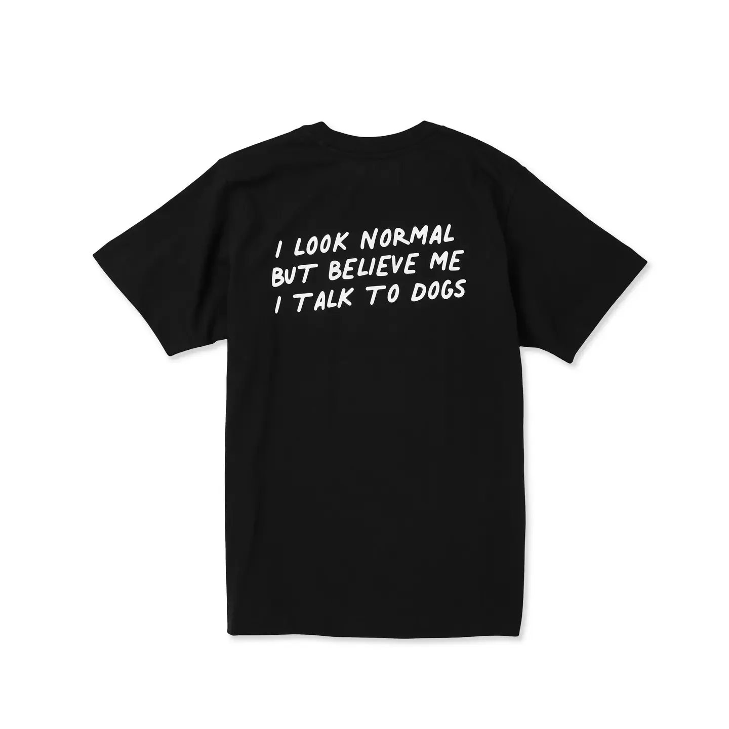 Ce t-shirt unisexe noir avec imprimé au dos « I look normal but believe me I talk to dogs »* est fabriqué en coton biologique.
