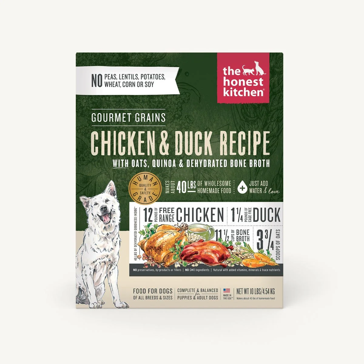 The Honest Kitchen croit que les aliments entiers de qualité humaine fournissent aux animaux de compagnie la meilleure nutrition possible. Cette recette de céréales gourmet est faite à partir d’ingrédients que vous reconnaîtrez dans votre propre cuisine, comme le poulet fermier, le canard sans cage, l’avoine biologique et le quinoa, tous déshydratés pour conserver les nutriments et le goût. Parfait pour les mangeurs difficiles, nous ajoutons une grande rafale de bouillon d’os savoureux et laissons de côté les pommes de terre, les pois, les lentilles, le maïs, le blé et le soja. Ajoutez simplement de l’eau tiède et attendez trois minutes pour un délicieux repas fait maison que vous et vos animaux de compagnie allez adorer!