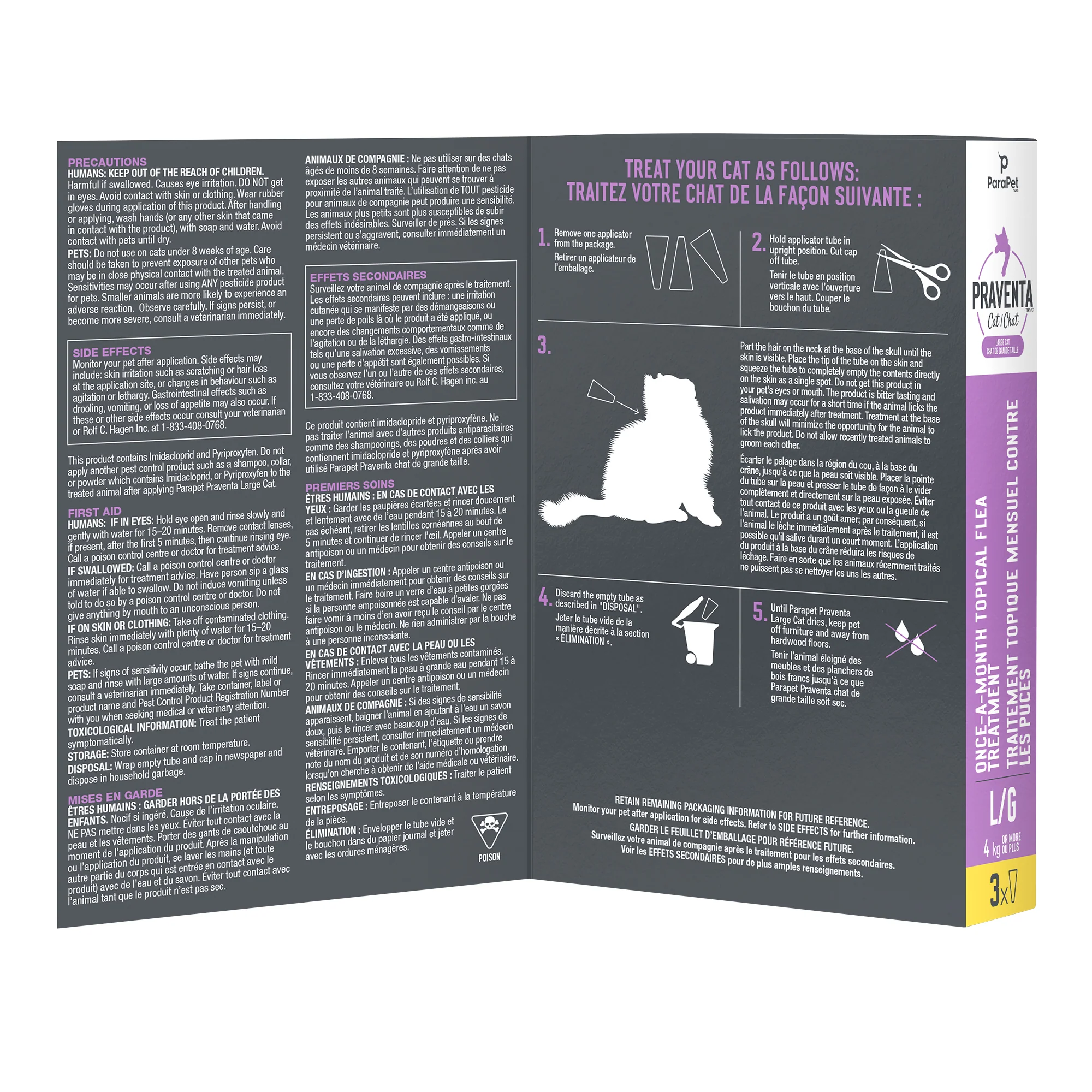 Voici le produit Praventa pour chats de Parapet, un traitement topique mensuel à large spectre de qualité vétérinaire contre les puces. Ce traitement comprend tous les bienfaits de la marque vétérinaire principale, mais offre aux détaillants une option à prix abordable. Contenant de l’imidaclopride et du pyriproxyfène, le traitement Praventa pour chats élimine et repousse les puces, les oeufs et les larves de puces au contact.